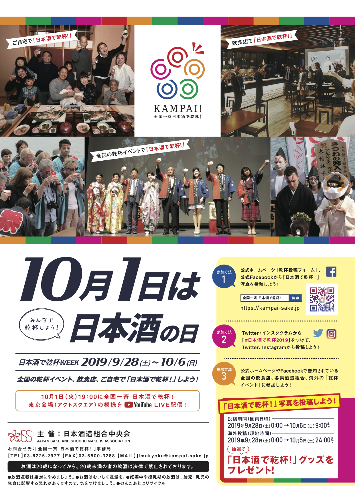 10月1日は日本酒の日 Facebook,Twitter,インスタ連動企画 2019.9.25 A4_KAMPAI ← ← 店内でご利用いただけるパンフレットは こちらよりダウンロードしてご自身で印刷してください。 10月1日は日本酒の日 お客様と一緒に乾杯!FB,Twitter,インスタからみんなで「乾杯」を投稿しよう!